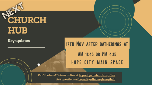 This is a chance for everyone to be kept updated about important news and development in our church. Our elders will be anchoring the session and you can ask questions. There's livestream option (hopecityedinburgh.org/live) for those who can't be here in-person and a recording made available after the session. Of course we will love to have our PM gathering folk join us if they can - a great chance to reunite for a while! You can start asking questions now at hopecityedinburgh.org/hub.